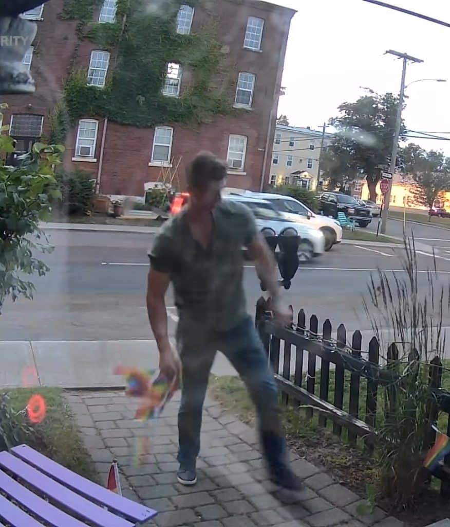 In the video footage provided to the Charlottetown Police Services, the suspect can be seen ripping down strings of Pride flags from the property and throwing them into the roadway.