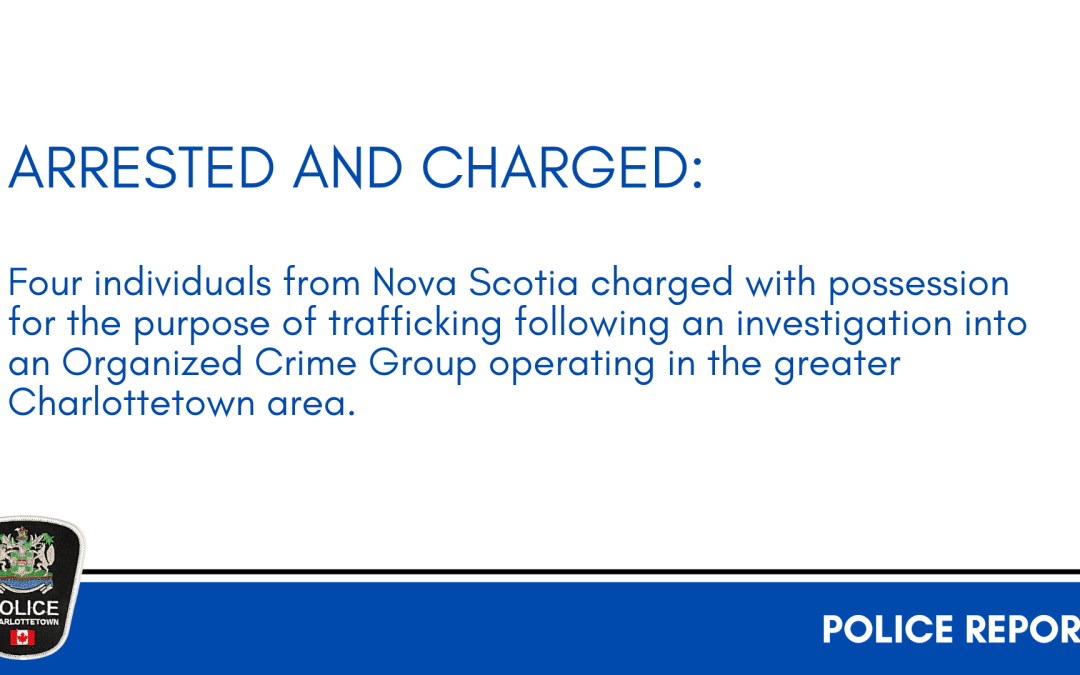Charlottetown Police Services Street Crime Unit arrested and charged four Nova Scotia individuals following an investigation into an Organized Crime Group operating in the greater Charlottetown area.